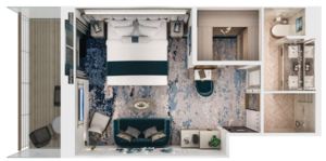 Redesigned in 2023, this luxurious suite features a walk-in wardrobe, separate living room and dining area, Jacuzzi bathtub, separate shower, bidet, and guest bathroom. Guests staying in this stylish home away from home enjoy unlimited dining at specialty restaurants, unlimited laundry services, afternoon canapés, flowers, binoculars, and a coffee maker.