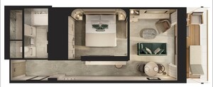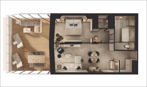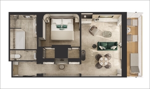 The welcoming entry corridor of the Signature Suite leads to an intimate dining area for two, where you can enjoy a delicious meal at any time of day or night. Then take in a movie from the plush sofa in the living area, or from the custom king bed in the spacious bedroom that features a second television. The bath offers the convenience of a double vanity for couples, a walk-in shower and a soaking tub, perfect for unwinding after adventures ashore. The ample 409 square feet of interior space is complemented by a private outdoor terrace of up to 151 square feet, where a comfortable lounger is equally suited to sunbathing or stargazing.
