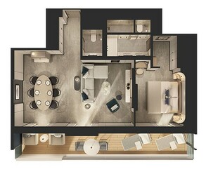Spacious indoors and out, the Concierge Suite offers up to 786 square feet of interior area and a private terrace of up to 409 square feet. The bedroom includes a generous walk-in wardrobe and dressing area as well as a marble bath with a double vanity, walk-in shower, soaking tub and an enclosed powder room accessible from the foyer. Sunlight casts a warm glow through the floor-to-ceiling glass in the bedroom and living room, which both open onto the terrace so you can step out to take in the views. The interior and outdoor spaces each feature an elegant dining area and a comfortable living area with a plush sofa, perfect for entertaining guests or enjoying a romantic evening for two.