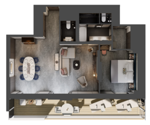 Spacious indoors and out, the Concierge Suite offers up to 786 square feet of interior area and a private terrace of up to 409 square feet. The bedroom includes a generous walk-in wardrobe and dressing area as well as a marble bath with a double vanity, walk-in shower, soaking tub and an enclosed powder room accessible from the foyer. Sunlight casts a warm glow through the floor-to-ceiling glass in the bedroom and living room, which both open onto the terrace so you can step out to take in the view, or enjoy an outdoor shower. The interior and outdoor spaces each feature an elegant dining area and a comfortable living area with a plush sofa, perfect for entertaining guests or enjoying a romantic evening for two.
