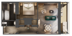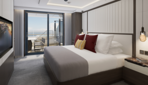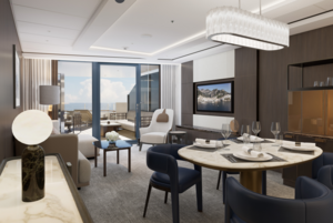The welcoming entry corridor of the Signature Suite leads to an intimate dining area for two, where you can enjoy a delicious meal at any time of day or night. Then take in a movie from the plush sofa in the living area, or from the custom king bed in the spacious bedroom that features a second television. The bath offers the convenience of a double vanity for couples, a walk-in shower and a soaking tub, perfect for unwinding after adventures ashore. The ample 409 square feet of interior space is complemented by a private outdoor terrace of up to 151 square feet, where a comfortable lounger is equally suited to sunbathing or stargazing.