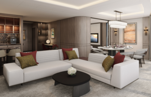 Natural light streams through the floor-to-ceiling windows of the Owner’s Suite, illuminating the interior of up to 1,033 square feet. The contemporary living area includes an in-suite bar for hosting cocktail hour before enjoying dinner with friends in the dining area — or alfresco on the expansive private terrace. After sunset, unwind under the stars in the terrace’s whirlpool spa and indulge in a soothing outdoor shower before heading inside to retire. The bedroom welcomes you to a sanctum of repose, complete with a custom king bed and spacious walk-in wardrobe, and the marble bath includes a modern shower, soaking tub, double vanity and in select suites, a powder room that can be accessed conveniently from the foyer.