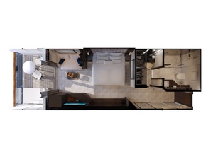 Abundant in space and light, the elegant Serenity Residences feature oversized floor-to-ceiling windows leading onto the expansive panoramic terrace on the ship's aft, including magnificent ocean views, a private outdoor whirlpool, a dining table, relaxing sun beds and a comfortable outdoor lounge designed by Molteni & C.