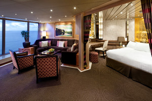 Generously proportioned and filled with light, these elegant suites include a living room, dining room, pantry with microwave, refrigerator and mini-bar, and floor-to-ceiling windows overlooking a private verandah. The bedroom features a king-size bed—our Signature Mariner's Dream™ bed with plush Euro-Top mattresses, plus a separate dressing room and the bath includes an oversize whirlpool bath and shower. There's also a sofa bed, suitable for two people, and a guest toilet. Amenities include a private stereo system, use of the exclusive Neptune Lounge, private concierge and an array of complimentary services.
