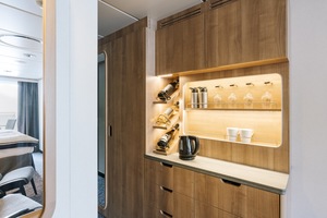 Suites with private balcony, different sizes, top-high decks, flexible sleeping arrangements, some with sofabed, TV, minibar, bathrobe, kettle, tea and coffee, espresso maker.