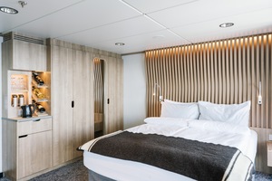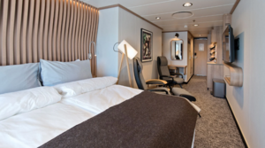 Extra Large Corner Suite without balcony. Aft corner suite with sofabed, flexible sleeping arrangements with double bed that can be divided into two single beds, large windows, TV, minibar, bathrobe, kettle, tea and coffee, espresso maker.