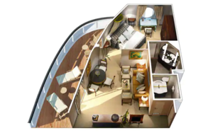 With entirely re-designed closets, dressers and vanities, these 165-square foot staterooms feel even more spacious. A generous seating area, vanity desk, refrigerated mini-bar and breakfast table are perfectly complemented by the soothing hues and stylish fabrics of the sleek new decor.
