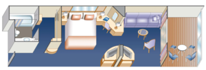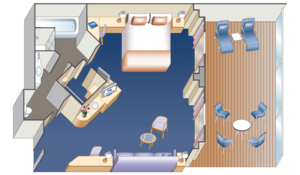 A premium stateroom category featuring our best located Mini-Suite staterooms, as well as the great amenities found in all Mini-Suites — plus premier dining benefits and luxurious perks. Each night, enjoy Reserve Dining, an exclusive dining area featuring expedited seating with no wait, additional menu options, dedicated wait staff and tableside preparations. Other amenities include priority embarkation and disembarkation, a complimentary one-time wine set-up and so much more!^