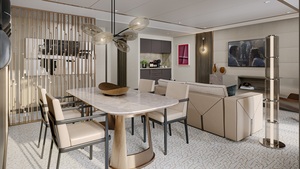 Comprising 6 suites in total, the Skyview Aura Suite (2,024 sq. ft.), Skyview Luna Suite (1,728 sq. ft.), and Skyview Sola Suite (1,325 sq. ft.) will be situated on Decks 14 and 15 and offer a sophisticated, high-end residential feel. An in-suite elevator transports guests to a peaceful terrace deck with shaded areas and jetted tubs that provides stunning views and opportunities for al fresco dining. Creating a luxurious and timeless experience, each Skyview Suite has its own unique layout and character, with design elements that combine classical detailing, a color palette of cool greys with black accents and pops of ruby red, clean lines, plus luxurious materials. The living areas are styled with a refined tone-on-tone décor with jewel-hued accents, while the dining spaces feature custom millwork and sculptural furniture.